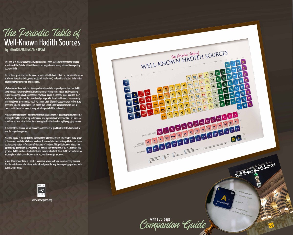 Infographic Download Here Companion Guide Download Here This one-of-a-kind visual created by Mawlana Abu Hasan, ingeniously adapts the familiar structure of the Periodic Table of Elements to categorise and convey information regarding books of Hadith. This brilliant guide provides the names of various Hadith books, their classification (based on attributes like authenticity, genre, and juridical relevance) and additional author information, all amazingly concentrated into one table. While a conventional periodic table organizes elements by physical properties, this Hadith table brings a rich array of works, including some obscure ones, into an easily navigable format. Books and collections of hadith have been placed in a specific order based on their attributes. Not only does the table classify a large selection of hadith works - some rarely mentioned even is seminaries - it also arranges them diligently based on their authenticity, genre and juridical significance. This means that a book's position alone reveals a lot of contextual information about it along with the period of the muhaddith. Although the table doesn't have the mathematical exactness of its elemental counterpart, it offers potential for uncovering patterns and new layers in Hadith scholarship. This novel approach serves as a valuable tool for exploring Hadith literature in a highly engaging manner. It is meant to be a visual aid for students and scholars to quickly identify texts relevant to specific subjects or genres. A helpful legend is included at the bottom of the table to help first-time readers make sense of the various symbols, labels and numbers. A more detailed companion guide has also been published separately to facilitate efficient use of the table. This guide includes a tabulated list of all the books with their authors’ full-names, brief definitions of the 51 different categories of Hadith mentioned in the table and two consolidated lists of Hadith works based on anthologies - totaling nearly 200 names - 170 with overlaps excluded. In sum, this Periodic Table of Hadith is an innovative and welcome contribution by Mawlana Abu Hasan to Islamic educational material, and paves the way for new pedagogical approaches in Islamic studies.