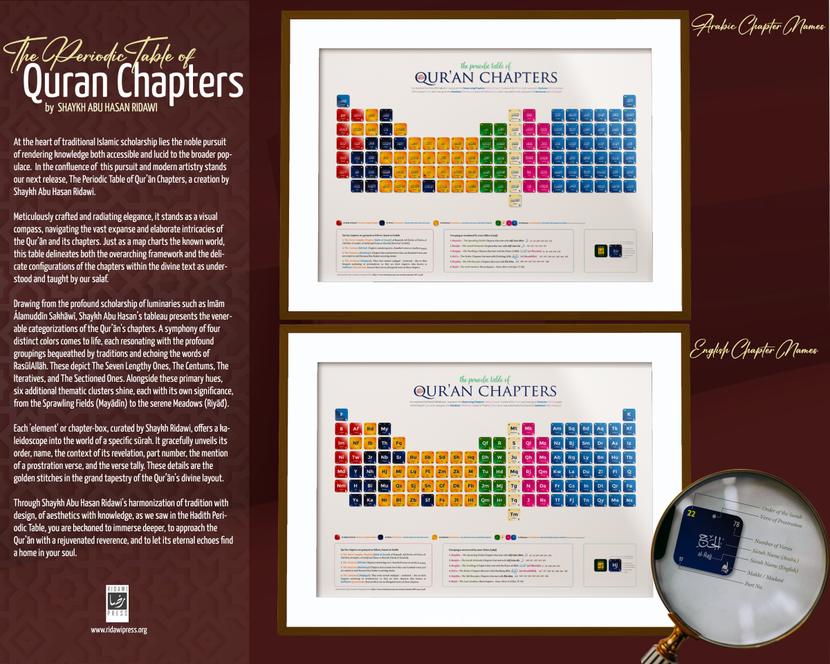 At the heart of traditional Islamic scholarship lies the noble pursuit of rendering knowledge both accessible and lucid to the broader populace. In the confluence of this pursuit and modern artistry stands our next release, The Periodic Table of Qur’ān Chapters, a creation by Shaykh Abu Hasan Ridawi. Meticulously crafted and radiating elegance, it stands as a visual compass, navigating the vast expanse and elaborate intricacies of the Qur’ān and its chapters. Just as a map charts the known world, this table delineates both the overarching framework and the delicate configurations of the chapters within the divine text as understood and taught by our salaf. Drawing from the profound scholarship of luminaries such as Imām Álamuddīn Sakhāwī, Shaykh Abu Hasan’s tableau presents the venerable categorizations of the Qur’ān's chapters. A symphony of four distinct colors comes to life, each resonating with the profound groupings bequeathed by traditions and echoing the words of RasūlAllāh. These depict The Seven Lengthy Ones, The Centums, The Iteratives, and The Sectioned Ones. Alongside these primary hues, six additional thematic clusters shine, each with its own significance, from the Sprawling Fields (Mayādīn) to the serene Meadows (Riyāđ). Each 'element' or chapter-box, curated by Shaykh Ridawi, offers a kaleidoscope into the world of a specific sūrah. It gracefully unveils its order, name, the context of its revelation, part number, the mention of a prostration verse, and the verse tally. These details are the golden stitches in the grand tapestry of the Qur’ān's divine layout. Through Shaykh Abu Hasan Ridawi's harmonization of tradition with design, of aesthetics with knowledge, as we saw in the Hadith Periodic Table, you are beckoned to immerse deeper, to approach the Qur’ān with a rejuvenated reverence, and to let its eternal echoes find a home in your soul. Download Here - Txt Version ( Optimized file size - Text PDF ) Download Here - ( Large file size Jpeg PDF ) Download - English Chapter names Version