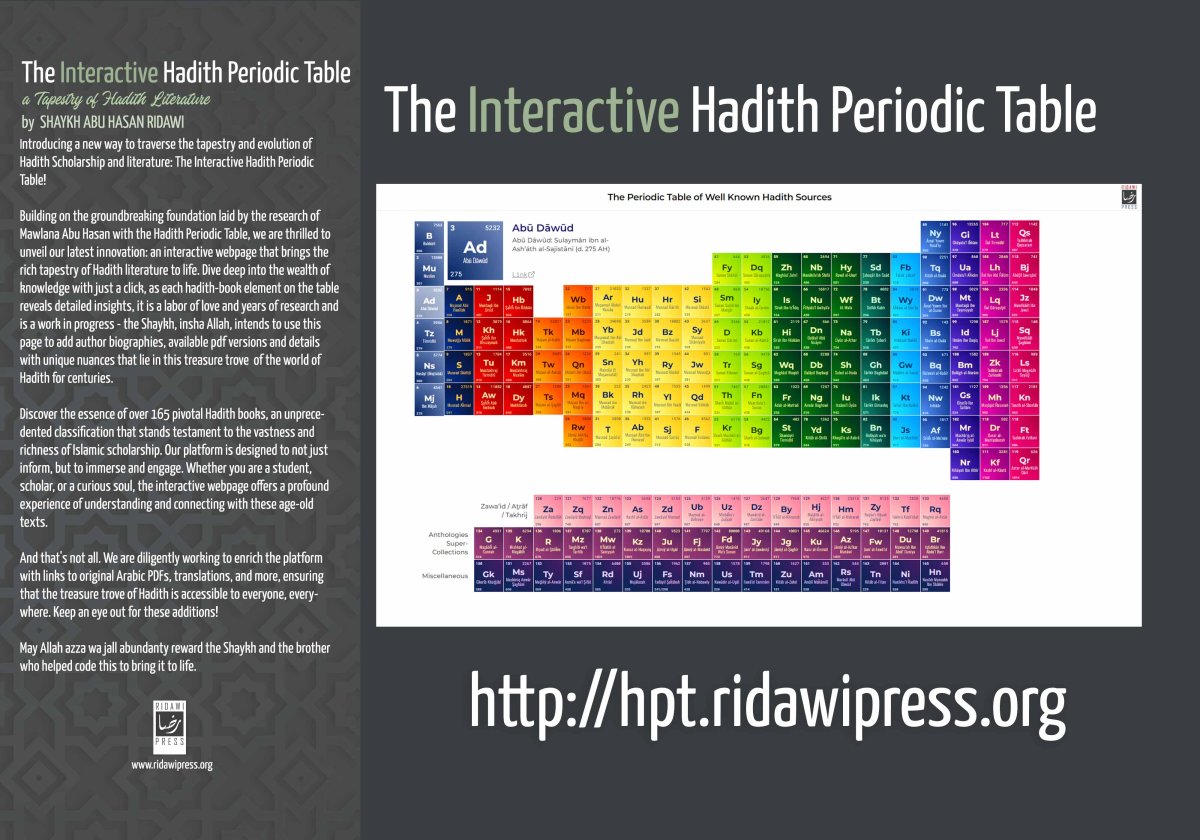 https://hpt.ridawipress.org/ Introducing a new way to traverse the tapestry and evolution of Hadith Scholarship and literature: The Interactive Hadith Periodic Table! Building on the groundbreaking foundation laid by the research of Mawlana Abu Hasan with the Hadith Periodic Table, we are thrilled to unveil our latest innovation: an interactive webpage that brings the rich tapestry of Hadith literature to life. Dive deep into the wealth of knowledge with just a click, as each hadith-book element on the table reveals detailed insights, it is a labor of love and years of research and is a work in progress - the Shaykh, insha Allah, intends to use this page to add author biographies, available pdf versions and details with unique nuances that lie in this treasure trove of the world of Hadith for centuries - May Allah azza wa jall abundanty reward the Shaykh and the brother who helped code this to bring it to life. Discover the essence of over 165 pivotal Hadith books, an unprecedented classification that stands testament to the vastness and richness of Islamic scholarship. Our platform is designed to not just inform, but to immerse and engage. Whether you are a student, scholar, or a curious soul, the interactive webpage offers a profound experience of understanding and connecting with these age-old texts. And that's not all. We are diligently working to enrich the platform with links to original Arabic PDFs, translations, and more, ensuring that the treasure trove of Hadith is accessible to everyone, everywhere. Keep an eye out for these additions in sha Allah! Venture into the new frontier of Hadith scholarship and exploration. Discover, learn, and be amazed at https://hpt.ridawipress.org/. Dive into the past, to illuminate the present.